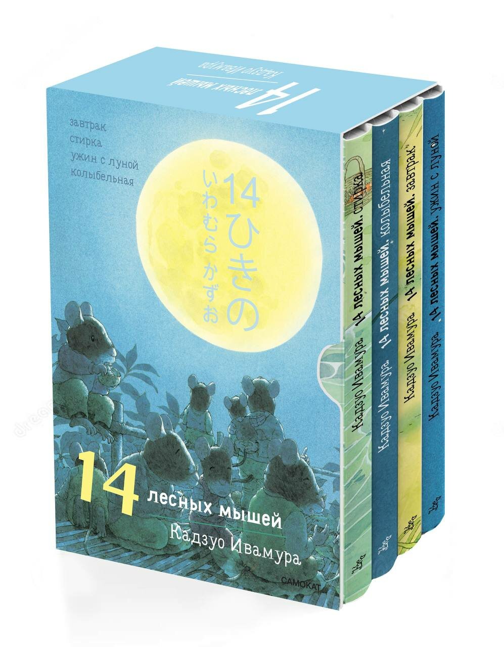 «14 лесных мышей» — очень популярная в Японии и многих европейских странах серия книг о красоте повседневности и о жизни трех поколений мышиного семейства: бабушки, дедушки, мамы, папы и еще десяток мышат. Мышкины книжки – новый формат для наших давно любимых мышей. Мы решили, что больших мышей с собой на прогулку, в коляску, машину или самолет взять сложно. Так что теперь мыши не только в два раза меньше размером, но еще и в интегральной, полумягкой обложке, а это значит, что они влезут даже в переполненный рюкзак! Теперь серия полностью представлена в карманном формате: 12 томов разбиваются на летний, зимний и суточный футляры. Зимний комплект: Сладкая картошка, Парад грибов, Зимний день и Новый год. Суточный комплект: Завтрак, Стирка, Ужин с луной, Колыбельная. Теперь у нас есть мыши на любой случай! 5 причин купить книгу «14 лесных мышей (мини). Суточный комплект»: Этот комплект из четырёх книг, как вино из одуванчиков, создаст ощущение летнего ветерка и тепла; Книги в упаковке из плотного картона будут идеально смотреться на полках, а также станут хорошим подарком; Увлекательное и умиротворяющее знакомство с японской культурой и традициями — теперь в мини-формате; Книга обладает всеми достоинствами виммельбуха и нонфика: наблюдая за жизнью мышат, ребёнок сможет развить внимание, логическое мышление, эмпатию и узнать много нового о природе; Кадзуо Ивамура — один из самых знаменитых и продаваемых в мире японских художников.
